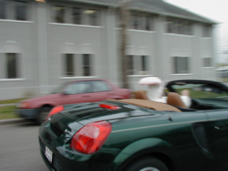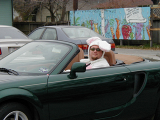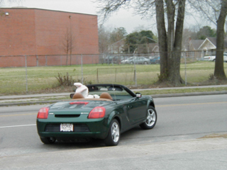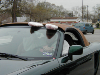 Once back at the Bunny Mansion, his ears got caught in the convertible top,